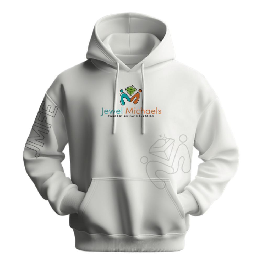 A white hoodie displaying the Jewel Michaels logo on the left chest, with minimal line drawings of figures on the sleeves.